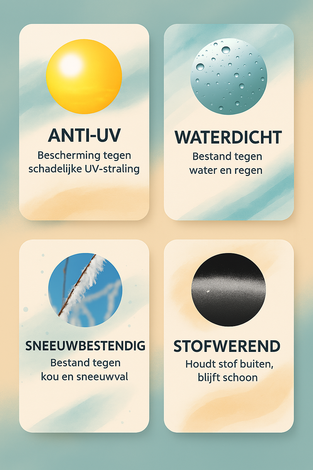 - Drievoudige bescherming: Waterdicht, UV-bestendig én vuilafstotend.