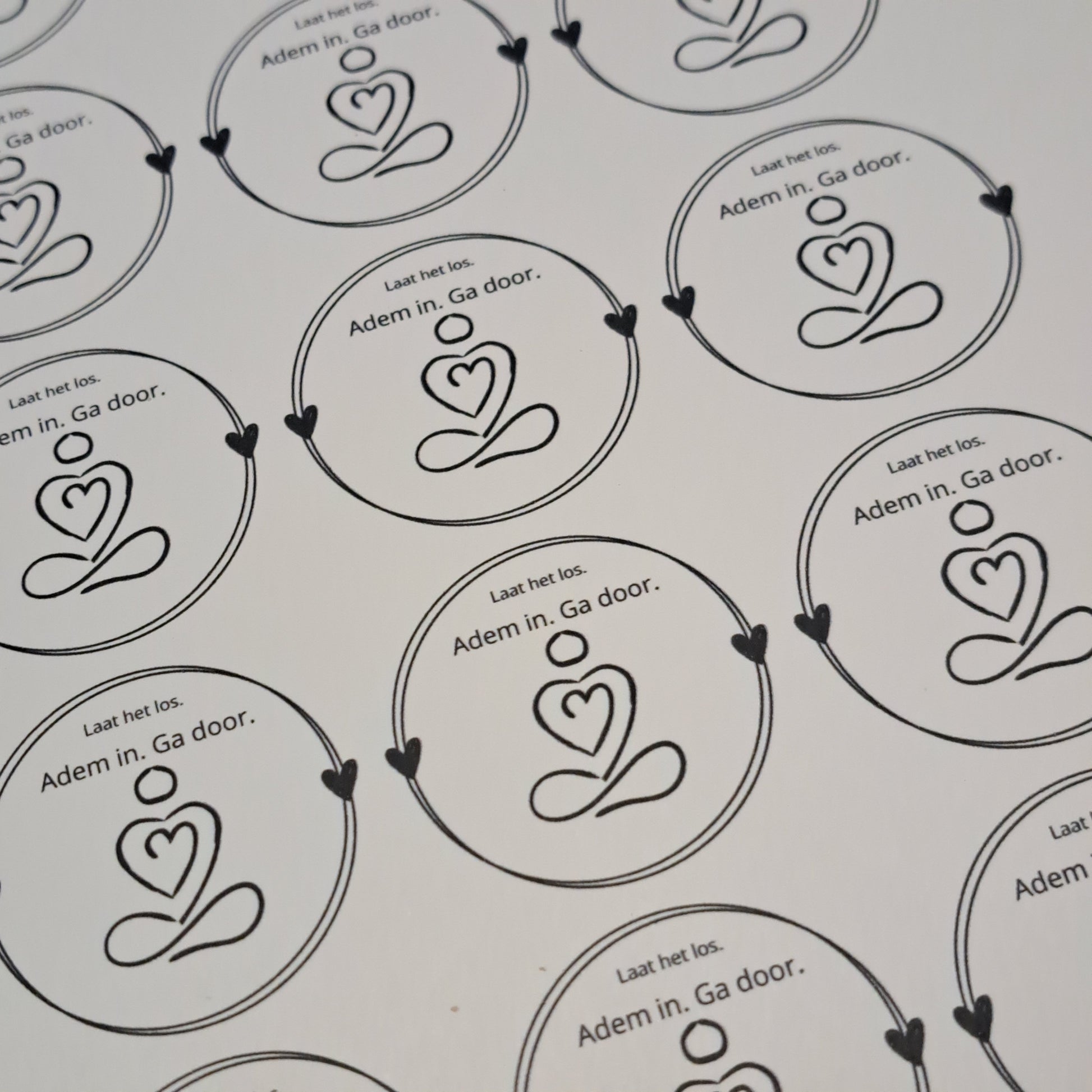 Deze elegante ronde sticker toont een lijntekening van een mediterende figuur in lotushouding, met een hartsymbool in het midden als teken van innerlijke rust. Omgeven door subtiele hartjes en de inspirerende tekst “Laat het los. Adem in. Ga door.”, brengt deze sticker een gevoel van kalmte en zelfcompassie. Ideaal voor planners, yoga journals, scrapbooks of als kleine reminder op je spiegel of laptop.