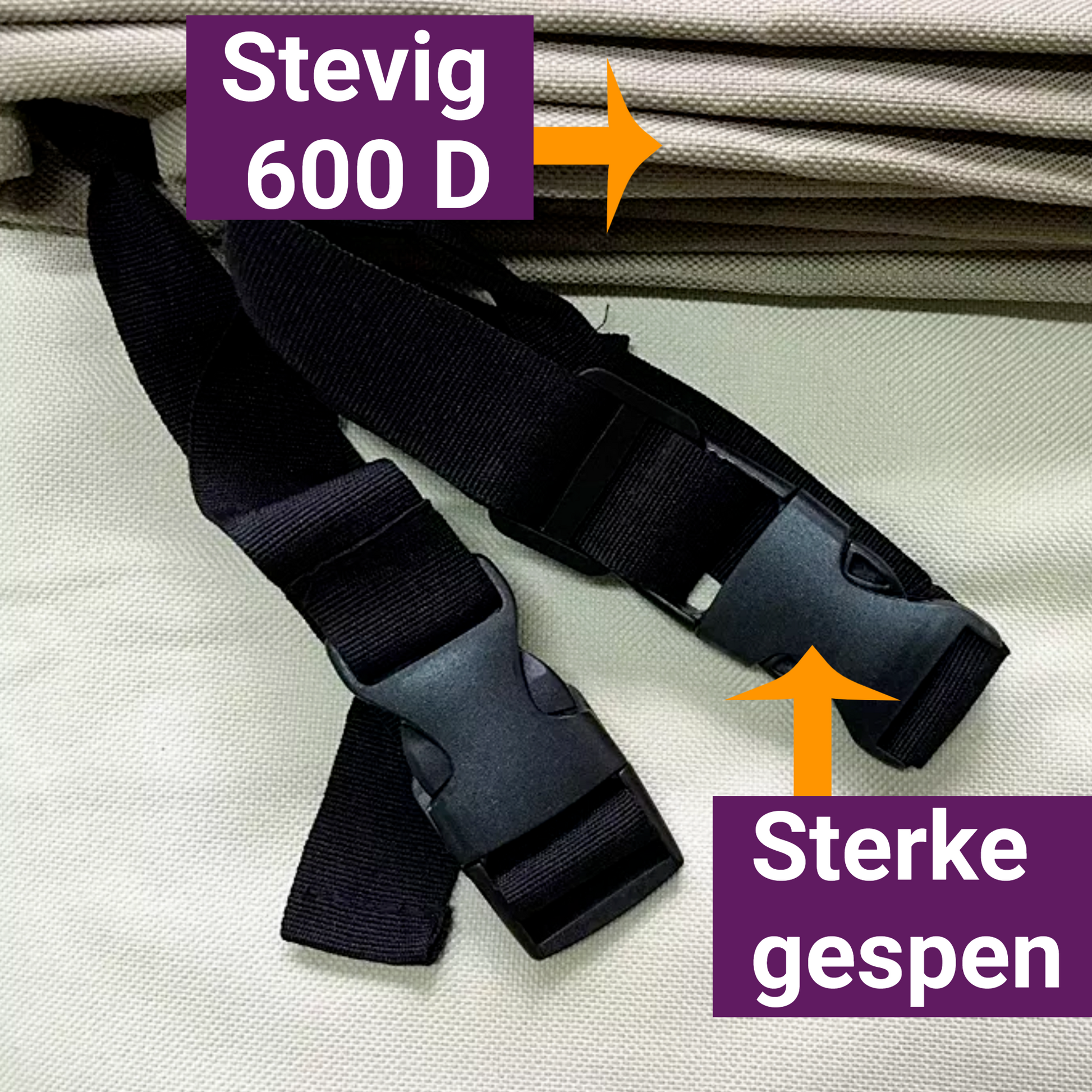 Naast dat we de hoezen van 600D hebben gemaakt, heeft de hoes ook een ventilatieband tegen schimmelvorming, en algengroei, omdat het vocht onder de hoes ook weg moet kunnen.