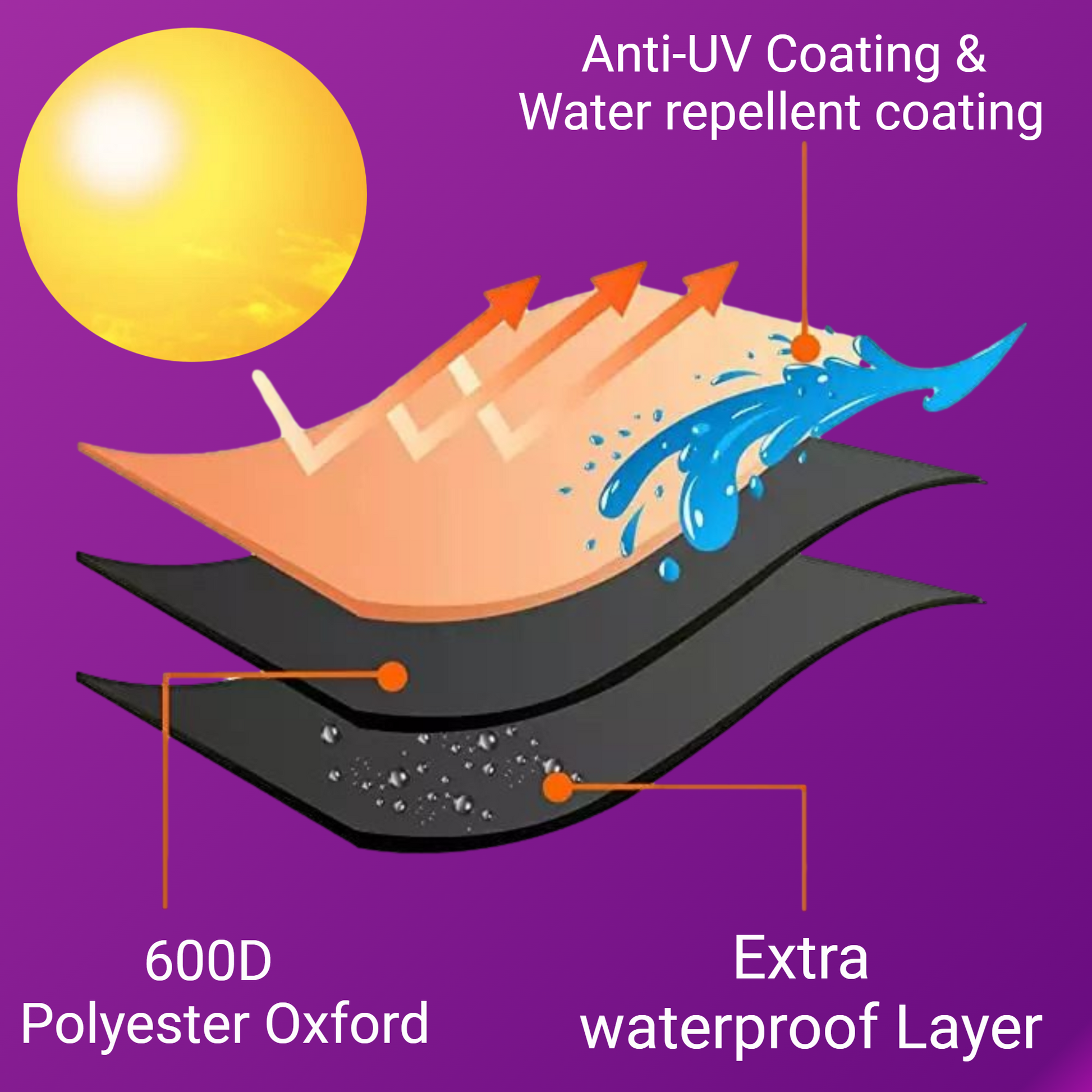 - Materiaal: PVC-laag, 600D Oxford polyester, UV-coating