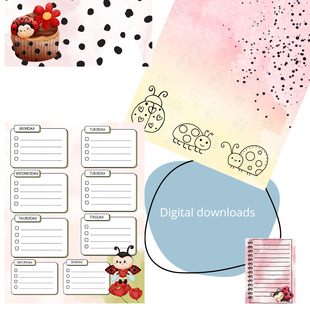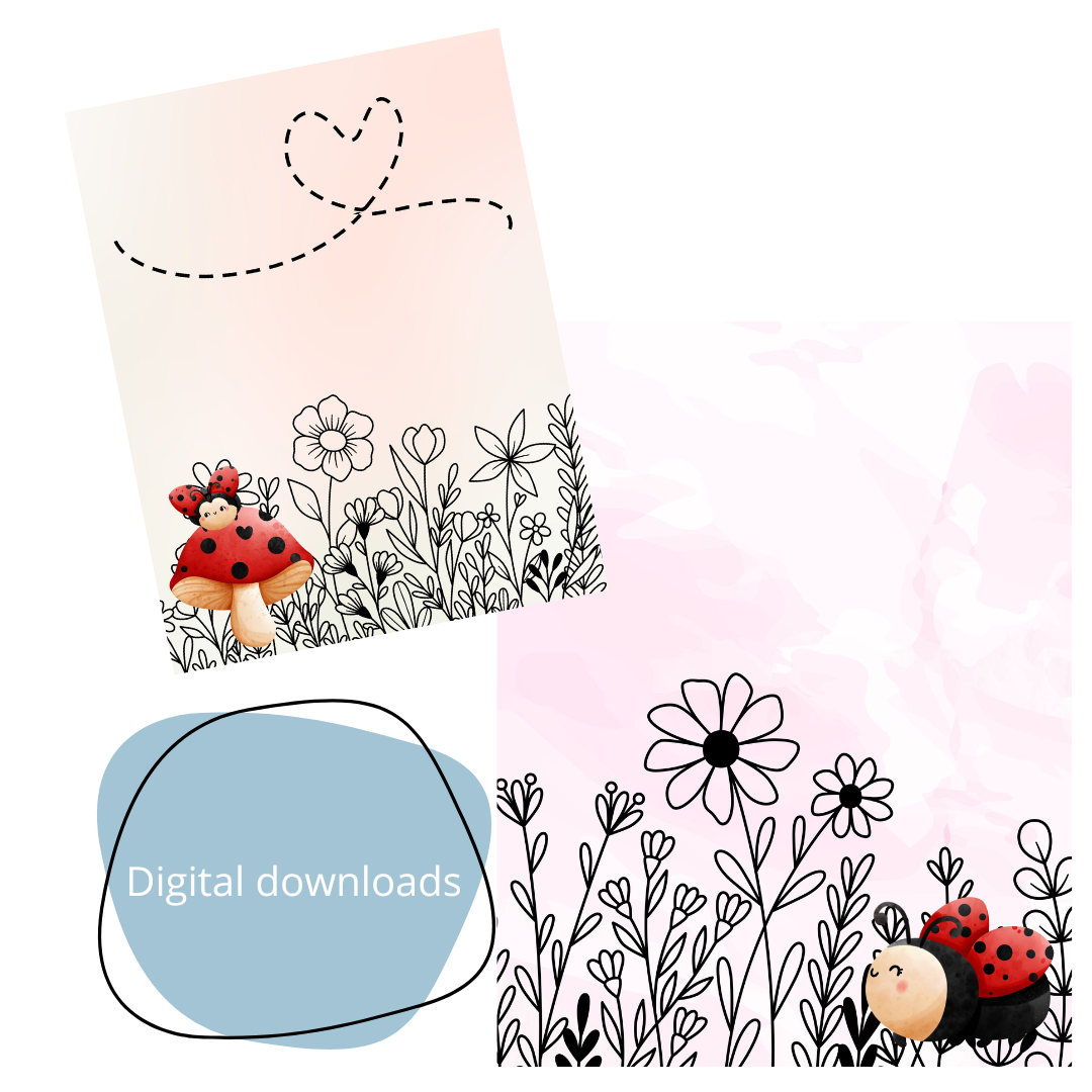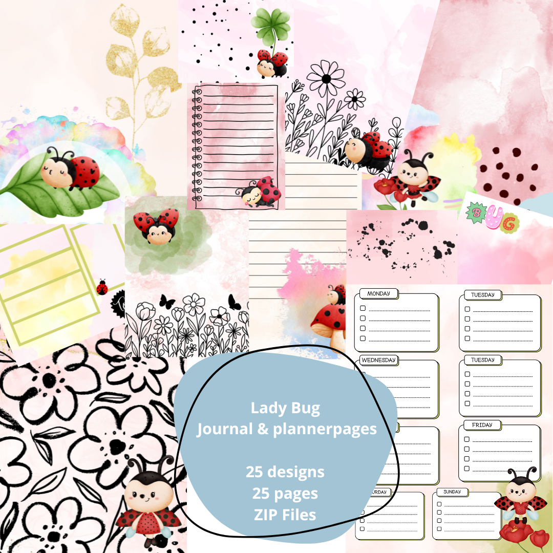 Dit charmante pakket bevat 25 prachtig geïllustreerde pagina's, ideaal voor journaling, plannen, en creatieve expressie. Elk ontwerp is liefdevol samengesteld met kleurrijke aquarellen, bloemenmotieven, en natuurlijk schattige lieveheersbeestjes als speelse accent.