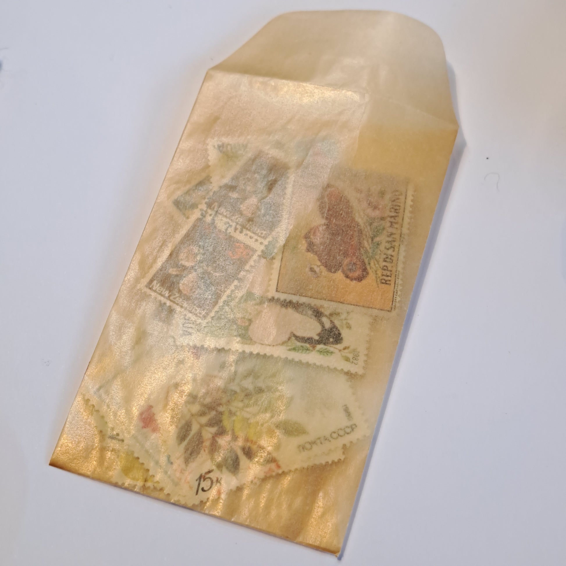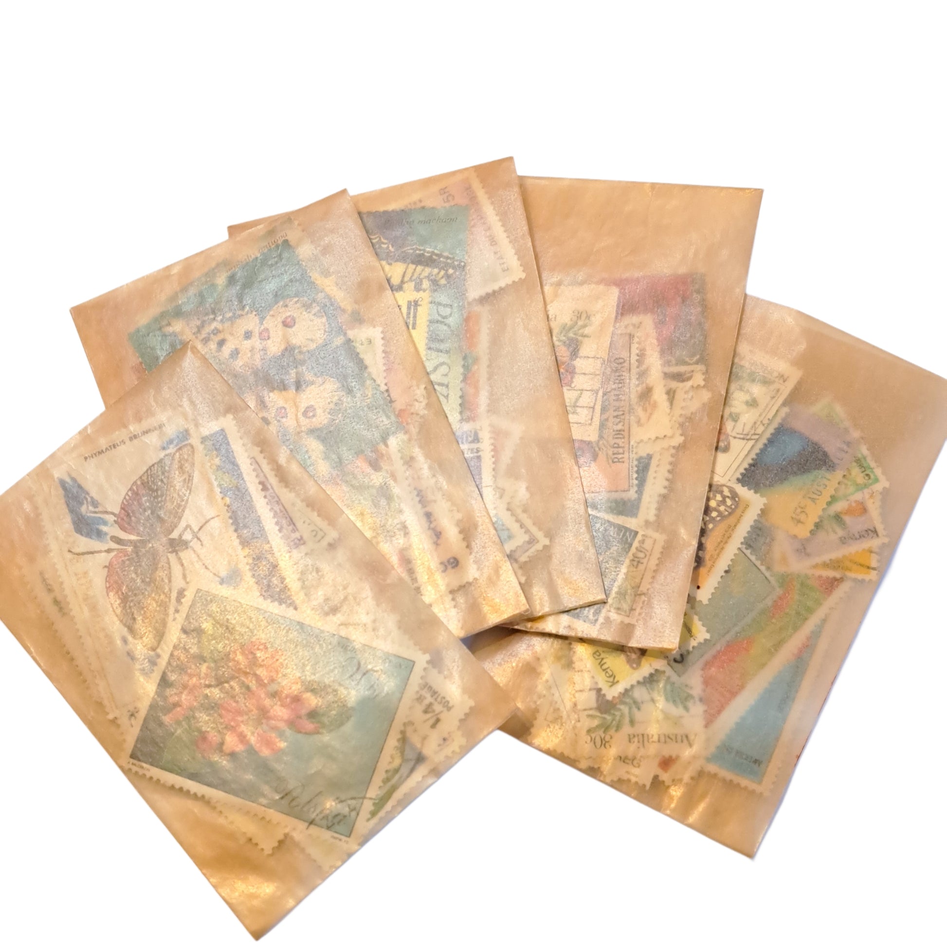 一個裝滿郵票的舊郵票袋,沒有一個袋子是一樣的,每個袋子裡都有不同的內容,袋子裡有花朵和蝴蝶的郵票。