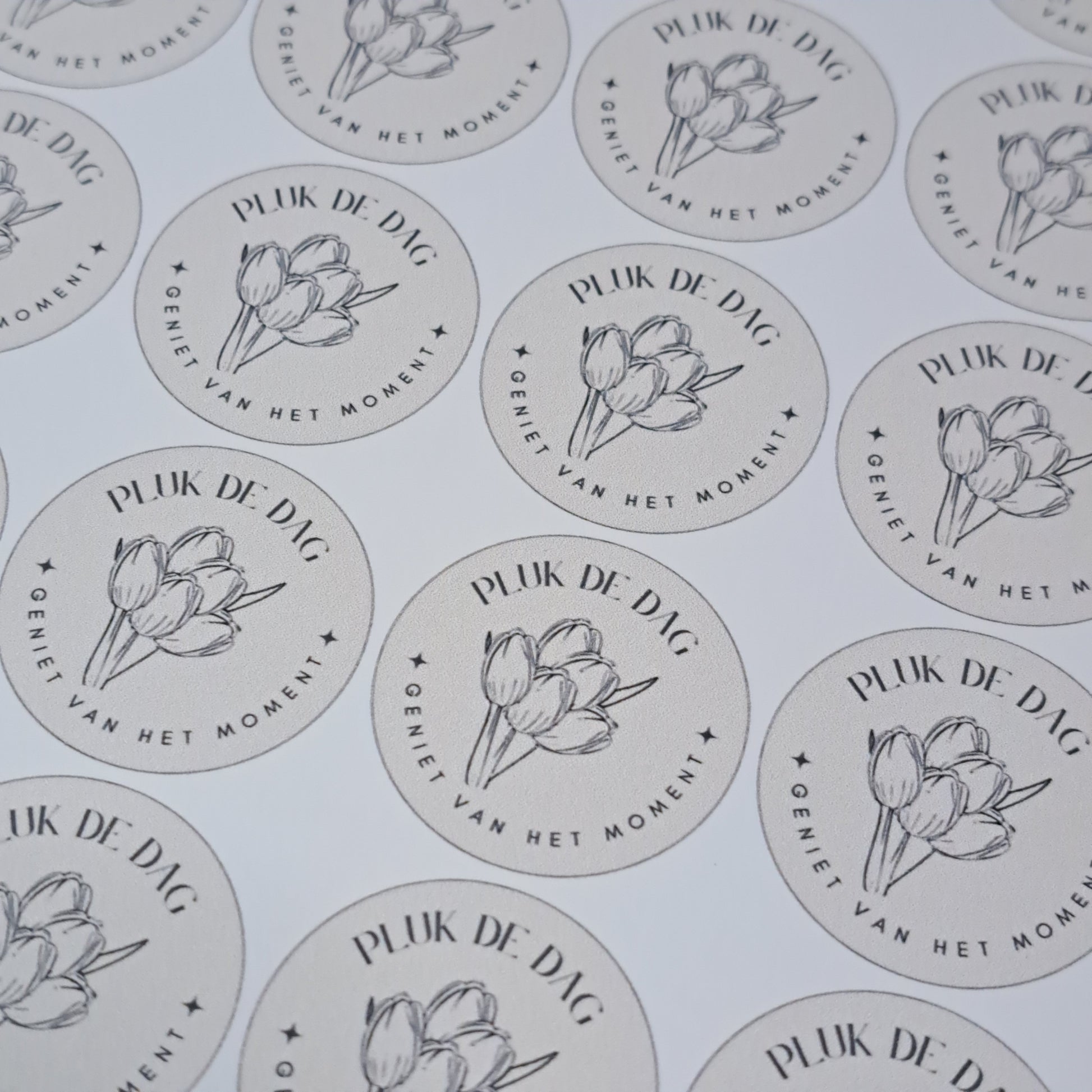 Een stijlvolle ronde digitale sticker met een minimalistische lijntekening van tulpen in het midden. Bovenaan prijkt de inspirerende tekst “PLUK DE DAG”, en onderaan “GENIET VAN HET MOMENT”, beide in strakke hoofdletters die de boodschap krachtig neerzetten. Twee stervormige symbolen aan weerszijden van de bloemen geven het ontwerp een speels accent. Deze sticker nodigt uit tot leven in het nu – ideaal voor planners, journal spreads, scrapbooks of om cadeauverpakkingen een betekenisvolle touch te geven.